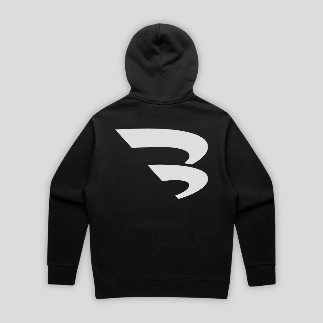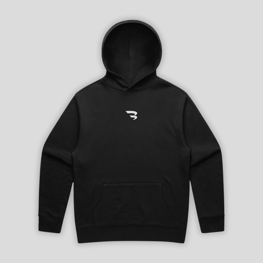 Relaxed fit hoodie on Black with a mid-weight fabric blend of 80% cotton and 20% recycled polyester fleece.